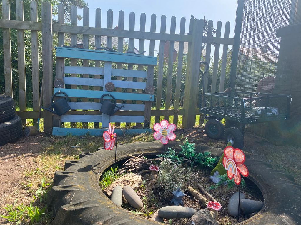 We have a lovely new natural area for Forest Fun where the children can explore in the mud, use the mud kitchen and even grow their own vegetables